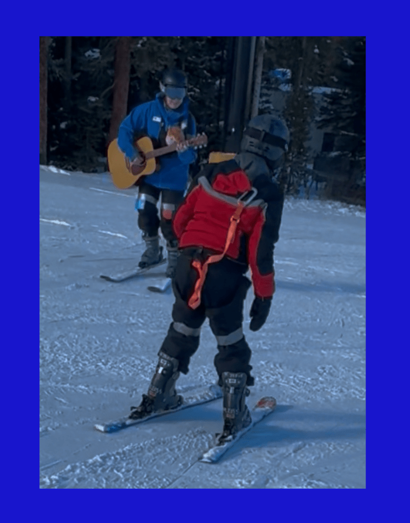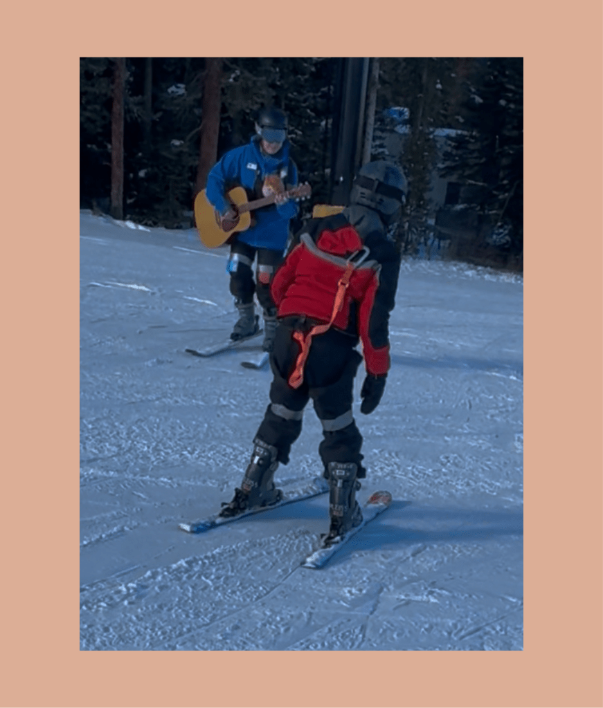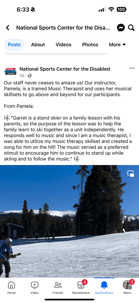 This inspired Pam to see what else she could do to implement a music therapist’s scope of practice on the ski hill. On January 3, 2024, Pamela became the first known documented music therapist to bring a guitar on the ski slopes of Winter Park. Pamela continued to utilize her scope of practice as a music therapist in the skills concept and five fundamentals of ski instruction in accordance to the PSIA. She loved to see how many of her students with cognitive disabilities would respond to the various tunes she would compose to teach them the basics of skiing.
