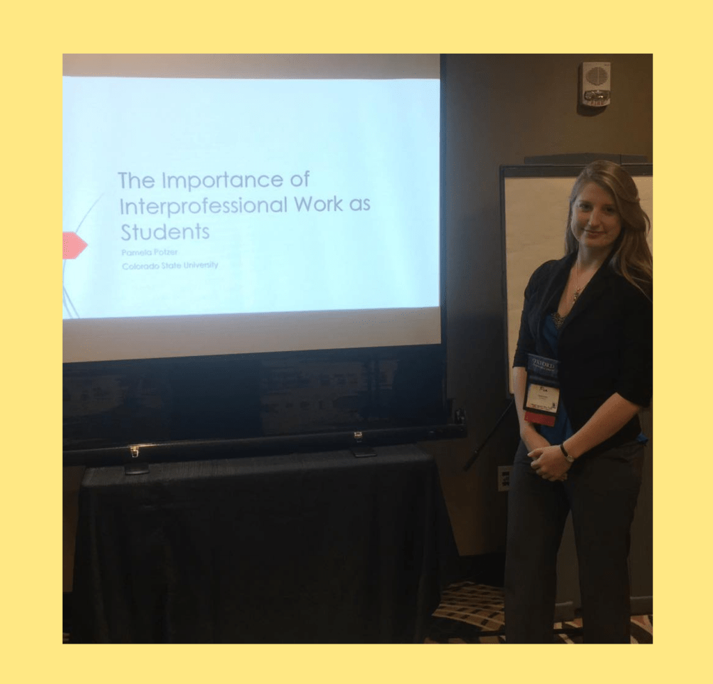 Pamela found that she loved talking to other students who were working towards physical and occupational therapy about her chosen profession of music therapy. Planning to go on to get her doctorate in occupational therapy, Pamela took extra classes, including introduction to occupational therapy and human anatomy. This anatomy course gave her the opportunity to study up to 20 human cadavers. But more importantly, Pamela got to study alongside pre-occupational therapy and pre-physical therapy students. This sparked one of Pamela’s newest passions – interprofessional work as students. Pamela began advocating to her music therapy cohorts the amazing opportunities for advocacy and collaboration when students prioritized working with other healthcare professional students.